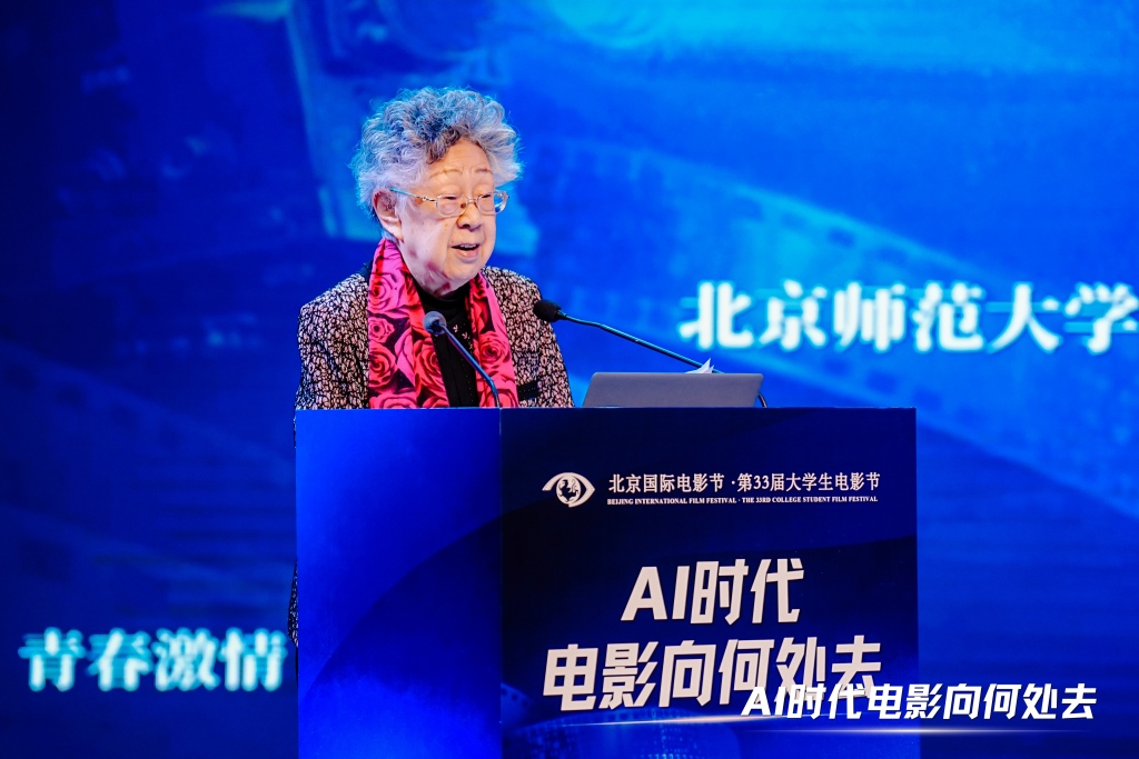 北京大学生电影节创始人、北京师范大学资深教授黄会林在发言中指出,AI时代为中国电影带来新机遇与新课题,既要借助AI降低创作门槛、拓宽传播渠道、适配人才需求,也要坚守电影本质,在内容上立得住、文化上有辨识度、情感上能共鸣。她强调:“青年处在电影文化的最重要现场,青年有判断力、有热情,还有创造未来的可能性。”