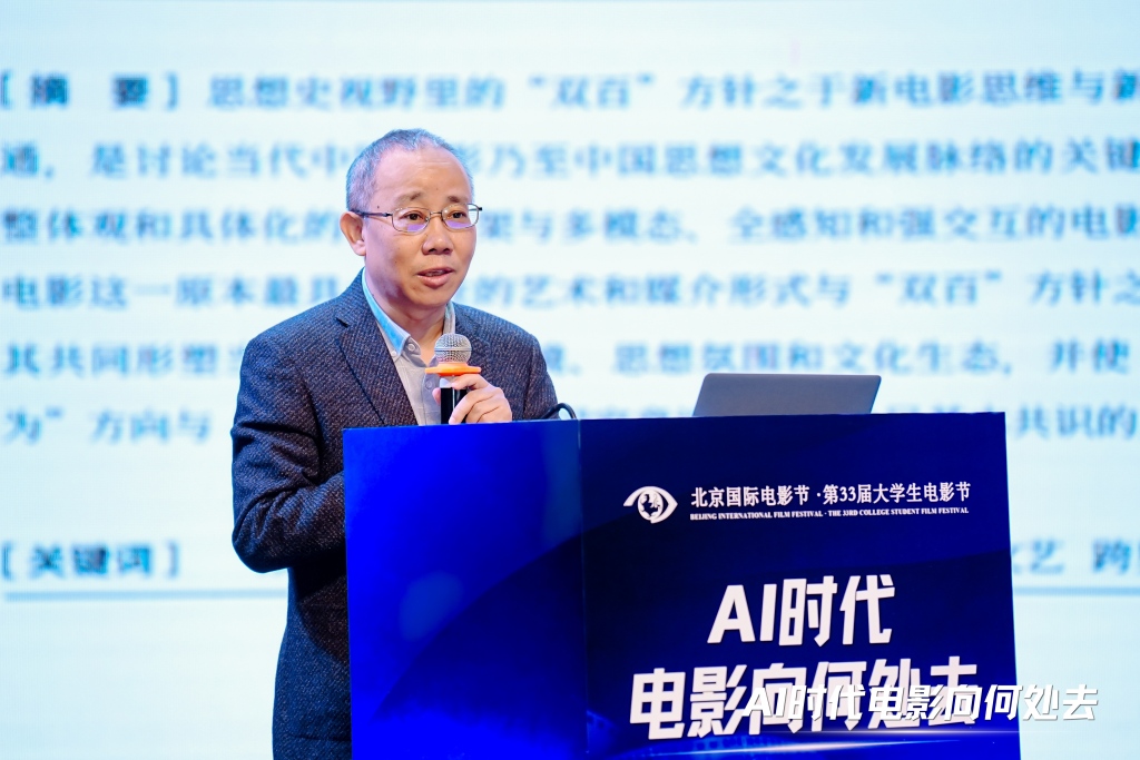 北京大学艺术学院教授李道新在发言中强调要推动新电影思维与新大众文艺跨界融通,依托中华优秀传统文化打造中国特色电影宇宙,实现中国电影从被动到主动、从模仿到创新的蜕变,构建多元载体的新大众文艺框架,“当整个世界变成一个屏幕的世界,屏幕与世界、人脑、AI之间的关系在某种意义上是具有可置换性的。”