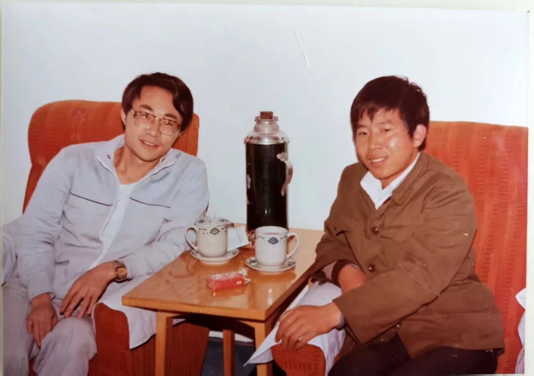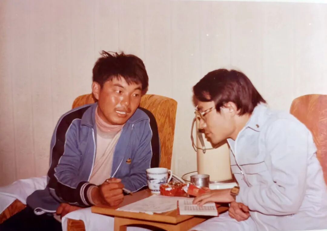 本文作者在攀枝花宾馆采访安徽“个体漂流户”王殿明(左),他曾只身靠密封船闯过上虎跳峡和下虎跳峡。