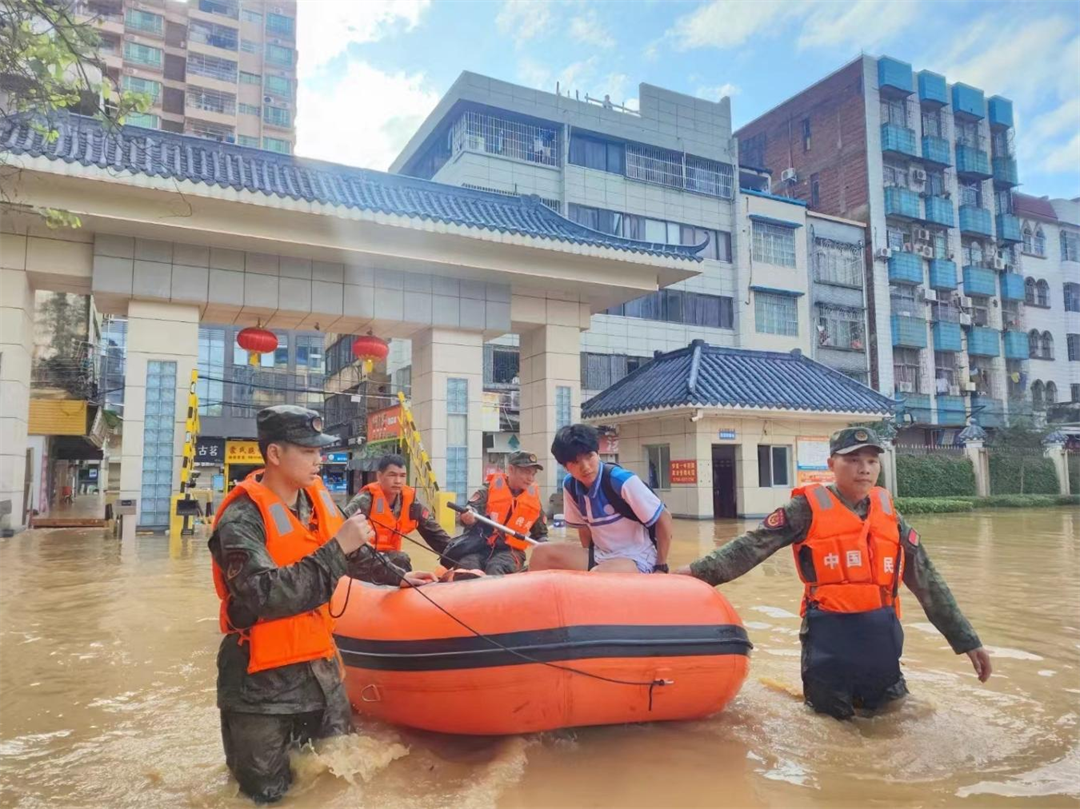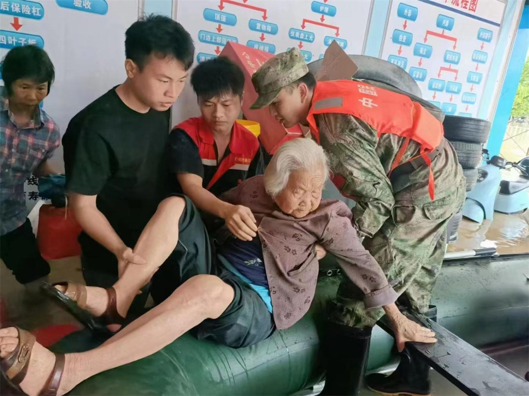 封开县莲都镇冷水村遭受严重内涝,积水深度达到居民住宅二楼,多户群众被困。面对如此险情,封开县人武部迅速调集20余名民兵,携带冲锋舟、橡皮艇及各类车辆7台,紧急驰援。救援队伍克服山体滑坡造成的道路堵塞等重重险情后抵达现场,民兵立即展开行动,在齐胸深的积水中挨家挨户喊话排查。他们采用背、抱等方式,蹚水小心翼翼地背负群众,将被困群众转移至救生艇。“拉住绳子!一二三,给我顶!”的号子声与“我们是民兵,大娘别怕”的安抚声交织。连续奋战10小时的民兵小黄虽然疲惫不堪,但眼神坚定地表示:“看到群众平安转移,再苦再累也值得。”