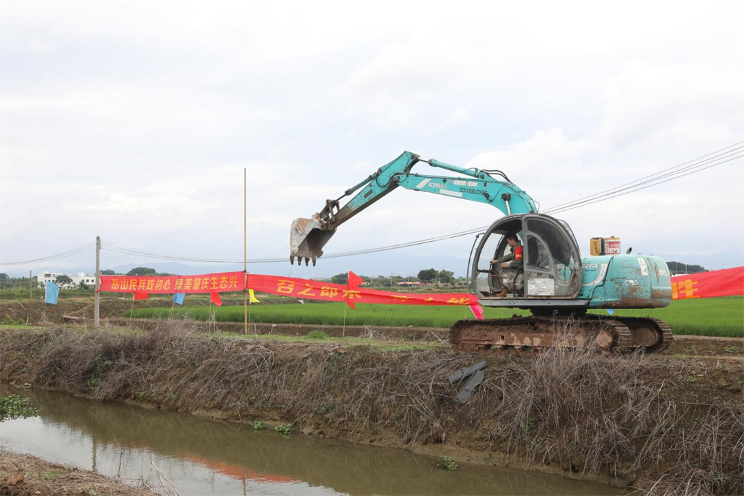 渠道因多年淤积陷入“肠梗阻”。板结的淤泥与水葫芦、浮萍几乎堵塞通道,严重威胁农田灌溉与汛期行洪。民兵“铁军”闻令而动,打响清淤攻坚战。工程机械手驾驶勾机担当“主力军”,有着十多年机械操作经验的民兵黄亦文等老手操控机械臂精准挖起硬化淤泥,灵活清除水面漂浮物,汗水浸透作训服仍全神贯注。在机械难以触及的狭窄区域,“岳山民兵连”连长邓欣夫高喊“党员跟我上”,率队扛起油锯劈开倒伏枯树,挥锹铲除盘根错节的杂草藤蔓。